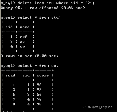 级联删除:将stu表中id为2的学生删除,该学生在sc表中的成绩也会级联删除