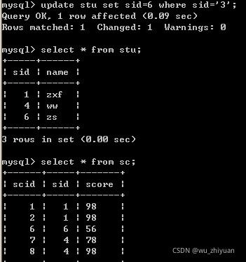 级联更新:stu表中id为3的学生更改为id为6,该学生在sc表中的对应id也会级联更新