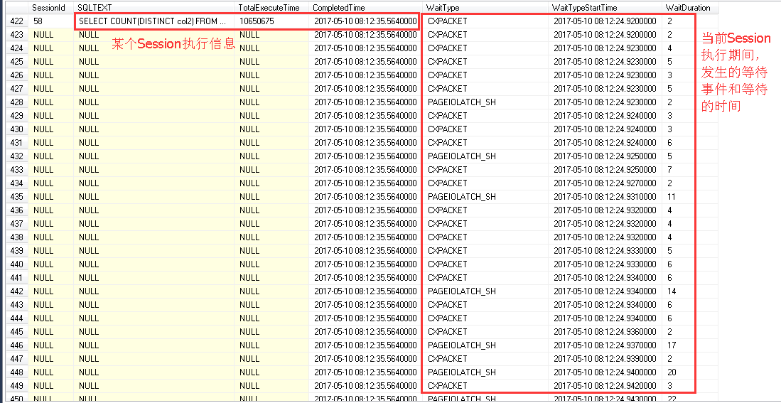 如下图是58号Session执行某SQL语句产生的等待详细信息,可以看到多次产生了CXPACKET和 PAGEIOLATCH_SH等待
