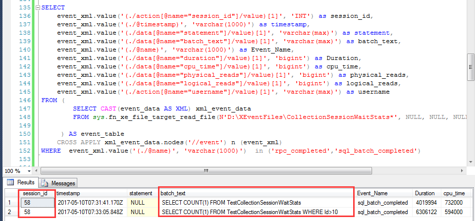 — Parse the XML to show rpc_completed,sql_batch_completed details