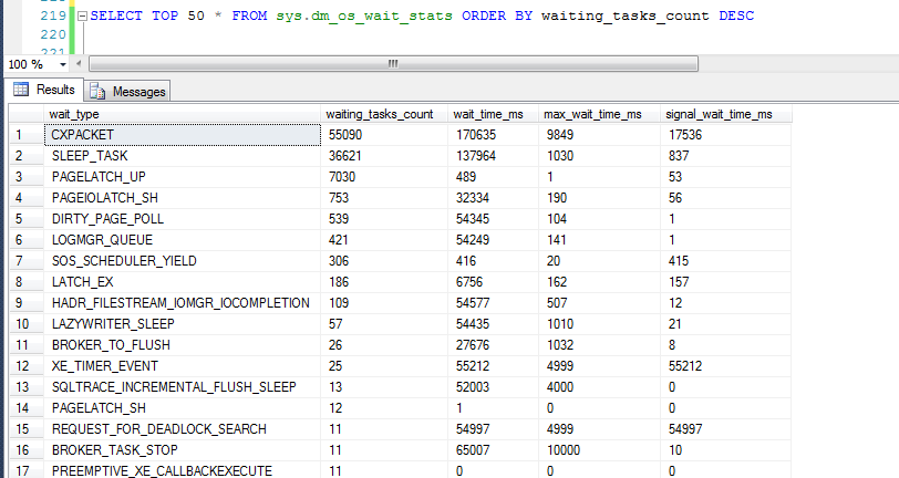 在SQL Server中有一个系统视图sys.dm_os_wait_stats记录了自数据库服务启动以来累积产生的等待信息,
