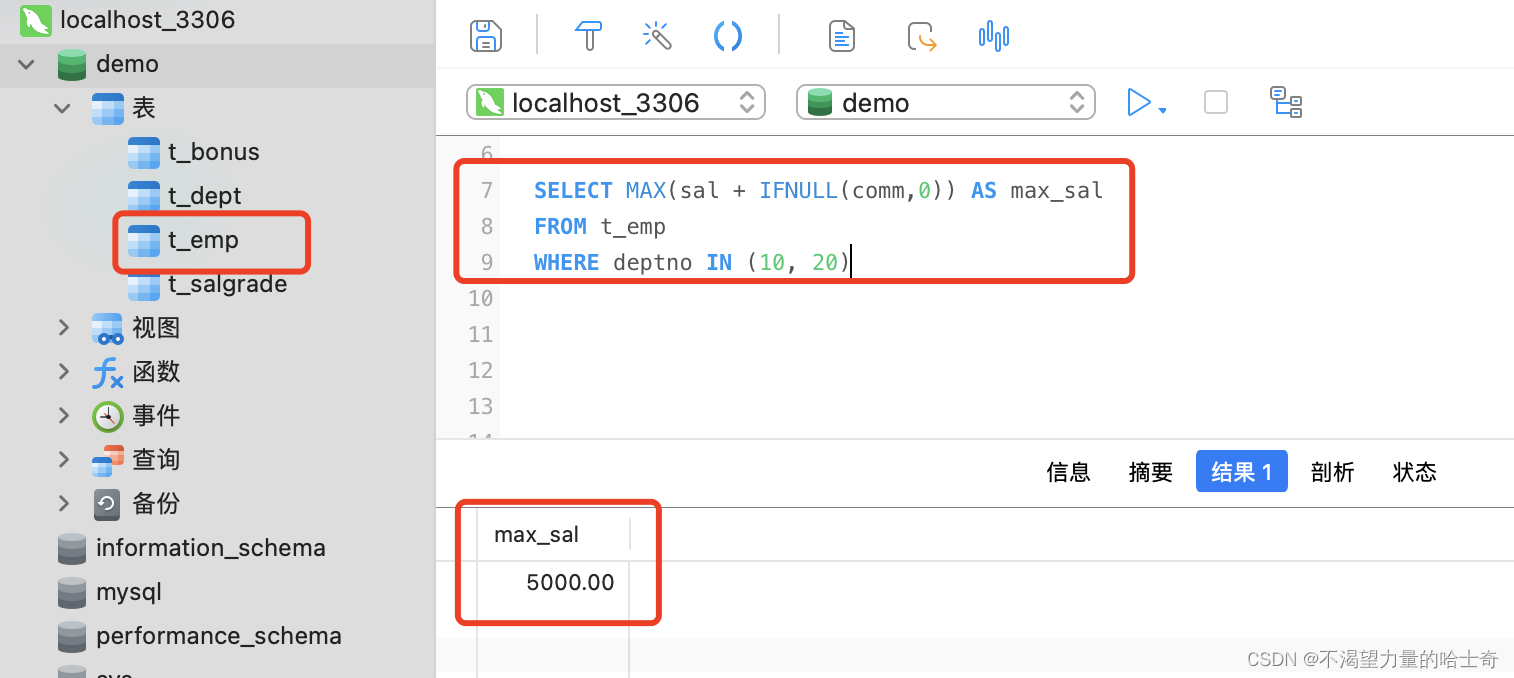 SQL 语句演示 MAX函数 案例(查询 10、20 部门的月收入最高的员工)
