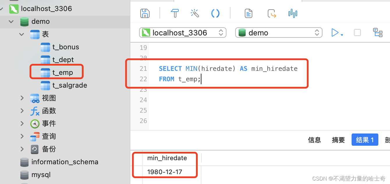 SQL语句演示 MIN函数 案例(查询 最早入职 的员工)