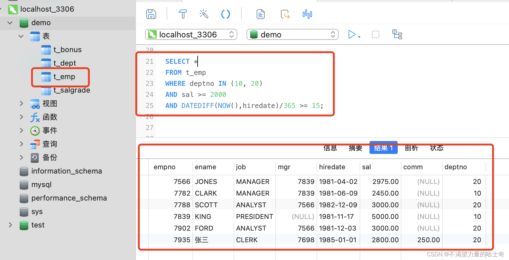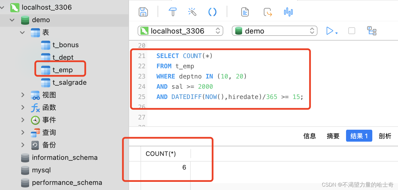 SQL 案例1 – 语句演示:(查询 10、20部门中,底薪超过 2000 并且工龄超过 15年 的员工人数)