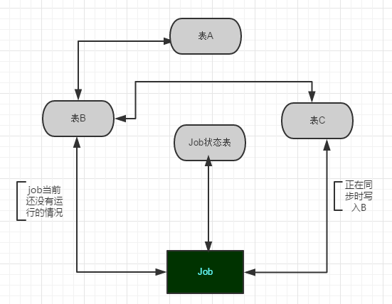 3. 建立同步数据的作业Job1和记录Job1运行状态的表,在同步的时候比较关键的是需要检查Job1的当前状态,如果当前正在将B的数据同步到A,则把服务端过来的数据存到C,然后再把数据导入到B,等到下一次Job执行的时候再将这批数据转到A。如图1: