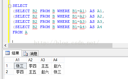 (SELECT B2 FROM B WHERE B1=A2) AS A2,