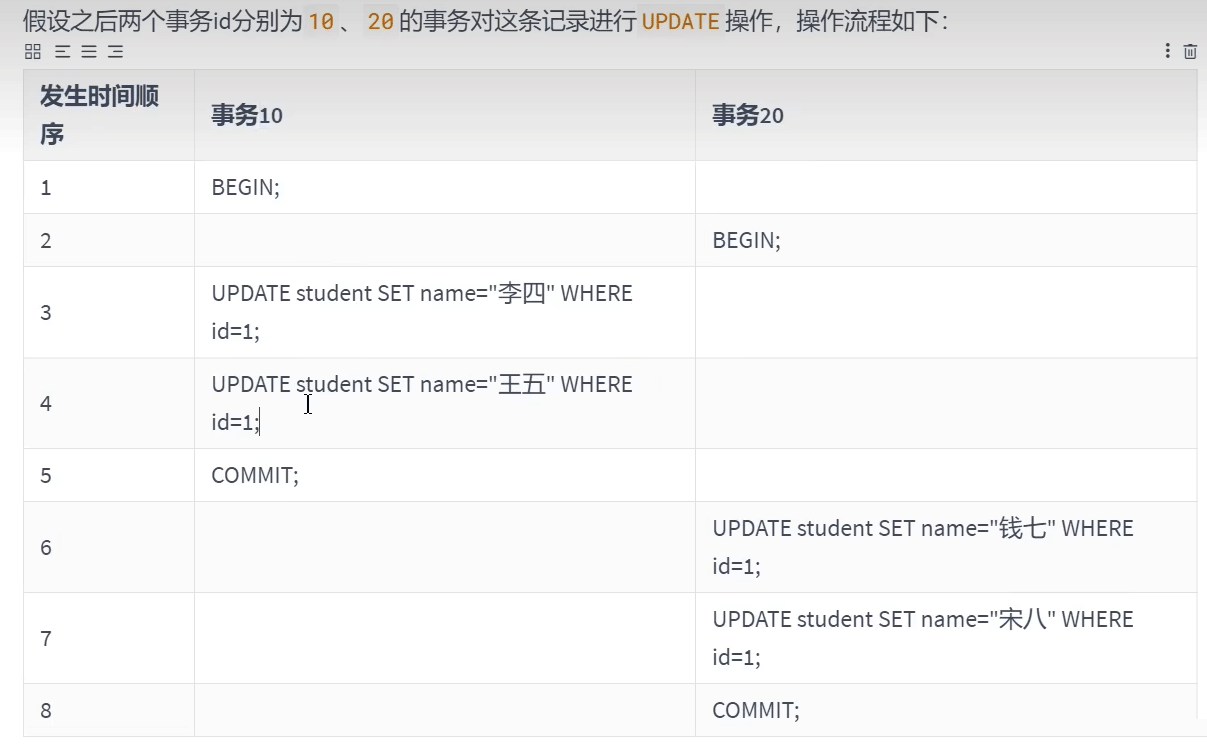 以此类推,如果之后事务id为20的记录也提交了,再次在使用READ CONMMITTED隔离级别的事务中查询表student中id值为1的记录时,得到的结果就是‘宋八’了,具体流程我们就不分析了。
