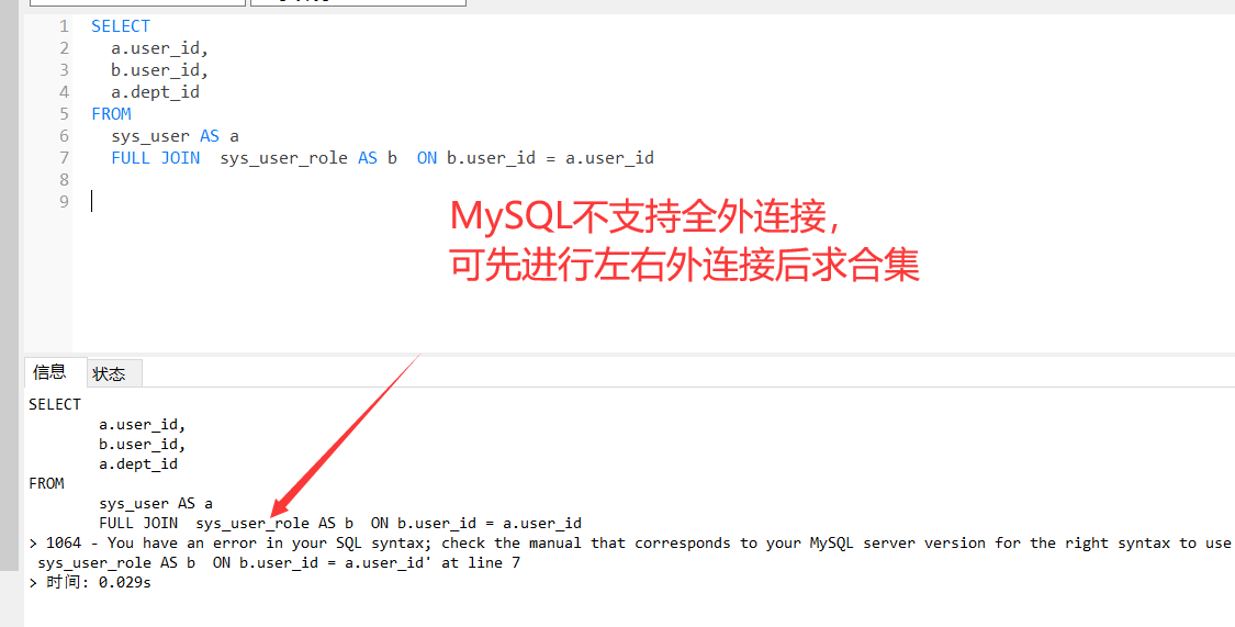 格式:SELECT <目标字段> FROM <FULL JOIN+表名+ON+连接条件> WHERE <查询条件>