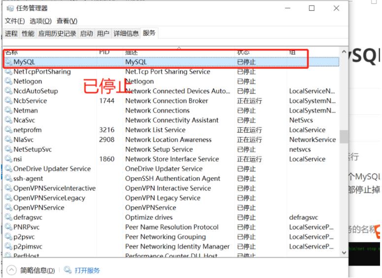 将MySQL服务停止,这里我只有一个MySQL服务,如有多个MySQL服务,也要全部停止掉。