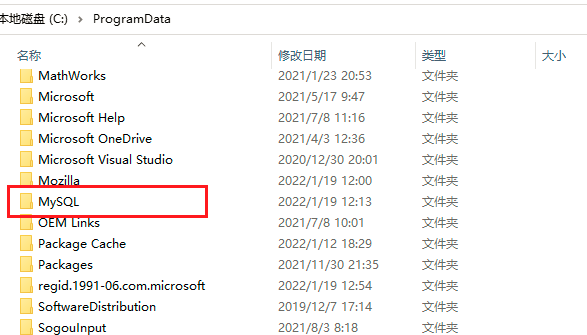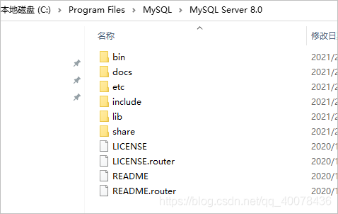 MySQL8.0默认安装路径C:\Program Files\MySQL,安装文件夹内容如图: