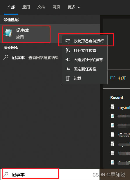 1、利用系统搜索记事本,弹出记事本后右键它选择以管理员身份运行。