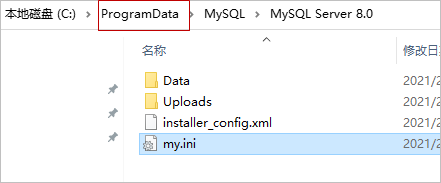 发现在安装目录中找不到my.ini文件,该文件在C:\ProgramData\MySQL\MySQL Server 8.0目录下。