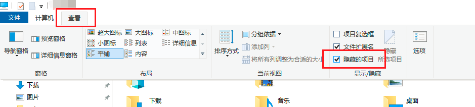 1、打开我的电脑,点击最上面的查看按钮,在打开的查看对话框中,找到隐藏的项目,把它勾选上。这样,隐藏的文件夹就会显示出来。