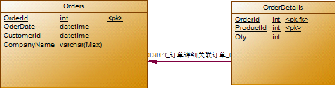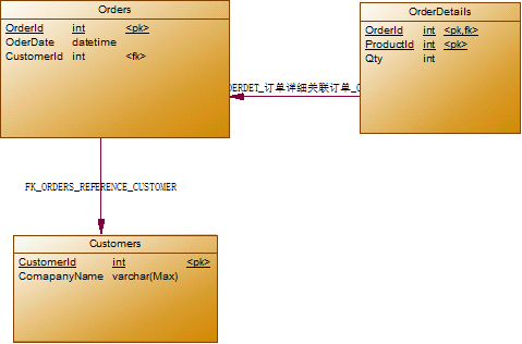 我们看看上述经过修改满足第二范式的两个表,此时订单表中OrderId为主键,客户Id即CustomerId和公司名称即CompanyName对OrderId是完全依赖,我们可以通过订单Id得到客户Id,也可以通过订单Id得到公司名称,同时我们也可以通过客户Id得到客户公司名称,也就是说此时CustomerId和CompanyName是一种传递关系,而非相互之间独立。此时若需要满足第三范式则应该是如下表示: