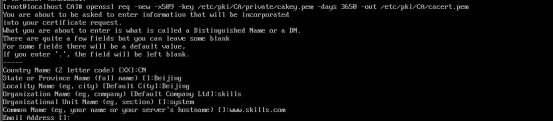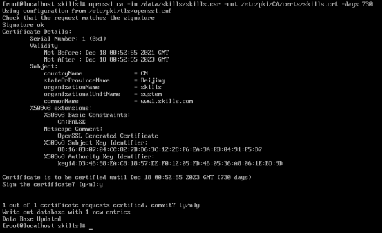 openssl ca -in /data/skills/skills.csr -out /etc/pki/CA/certs/skills.crt -days