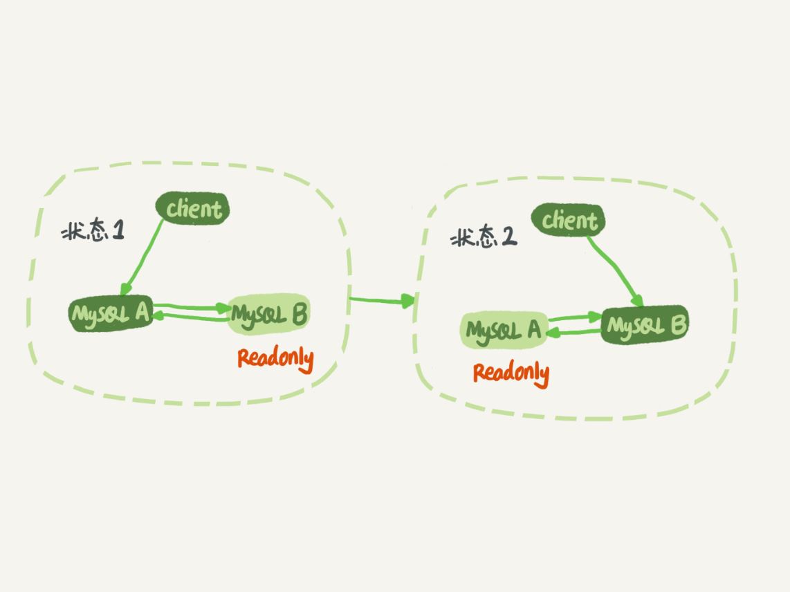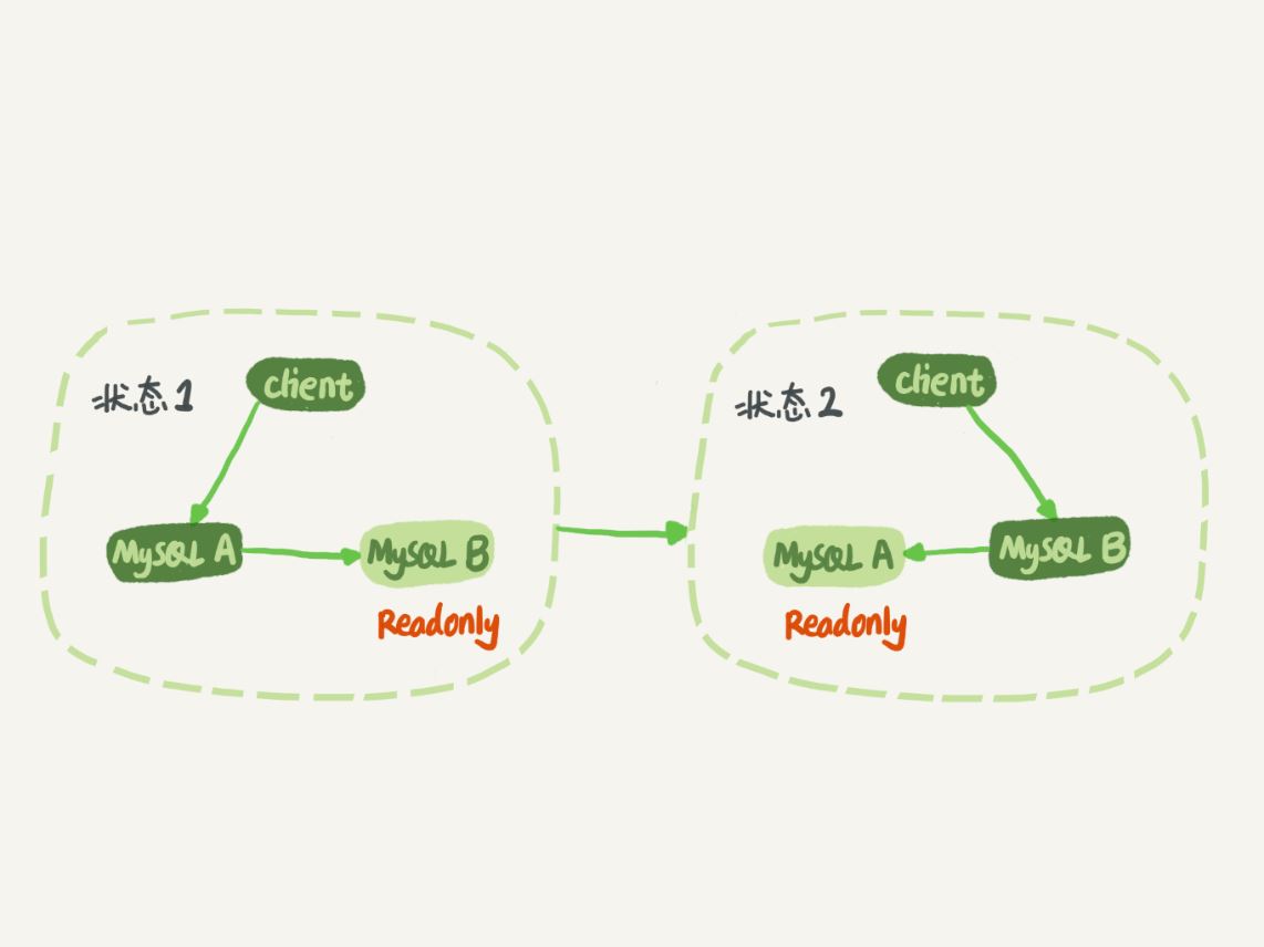 当需要切换的时候,就切成状态 2。这时候客户端读写访问的都是节点 B,而节点 A 是 B 的备库。