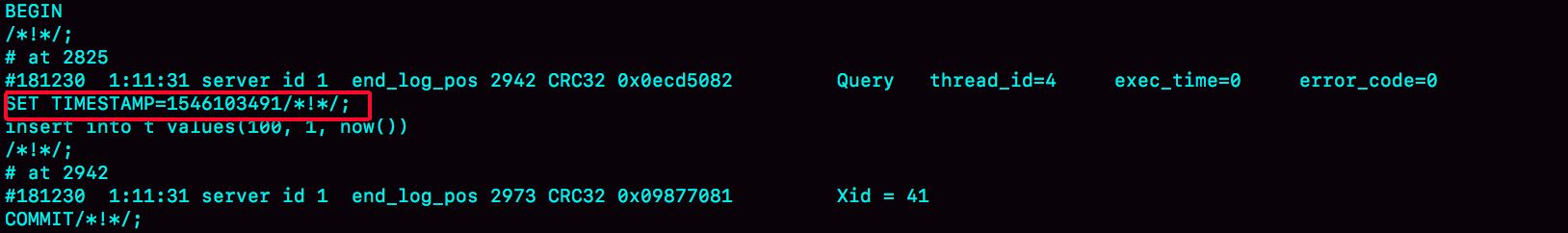 从图中的结果可以看到,原来 binlog 在记录 event 的时候,多记了一条命令:SET TIMESTAMP=1546103491。它用 SET TIMESTAMP 命令约定了接下来的 now() 函数的返回时间。