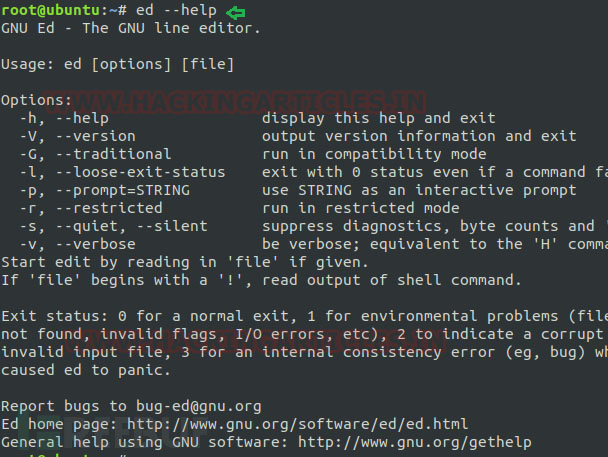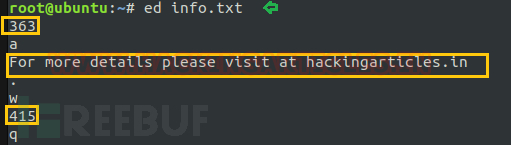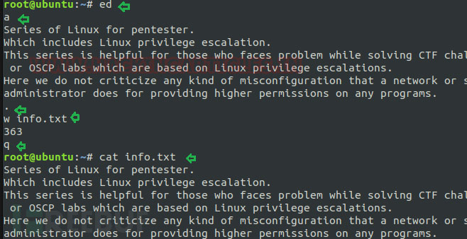 注:无论何时使用ed命令的任何选项你都需要使用 ‘a’, ‘.’, ‘w’, ‘q’命令 。