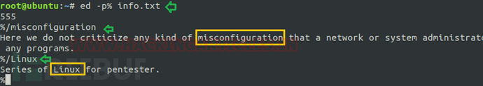 在下图中,ed仅打印了那些包括搜索关键字misconfiguration和Linux的行。
