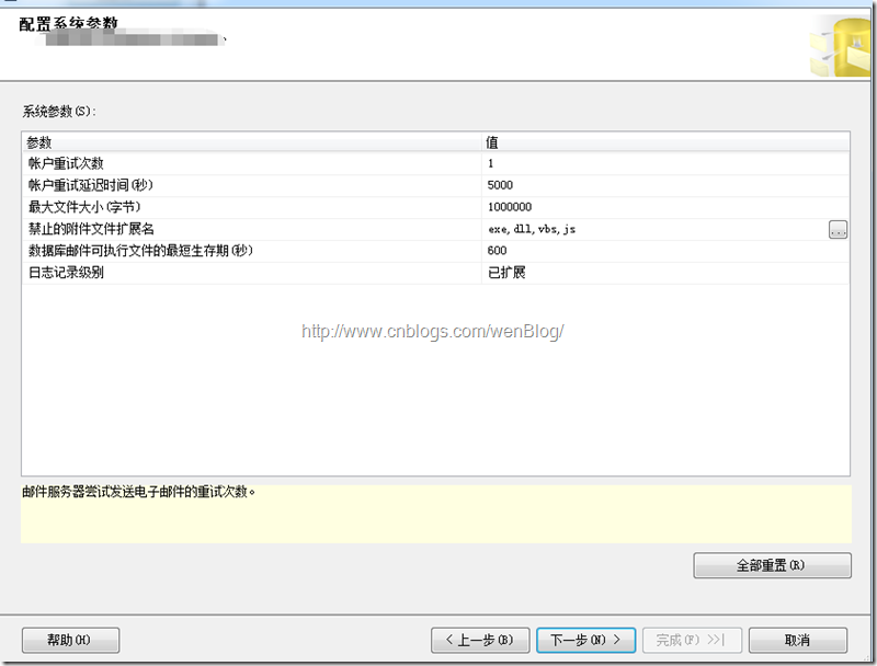 然后,可以修改“配置系统参数”,比如账户重试次数,禁止的附件文件扩展名,单击下一步,,默认配置即可:
