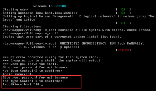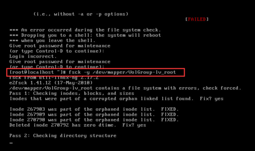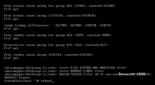 在修复模式下,输入命令fsck –y /dev/mapper/VolGroup-lv_root
