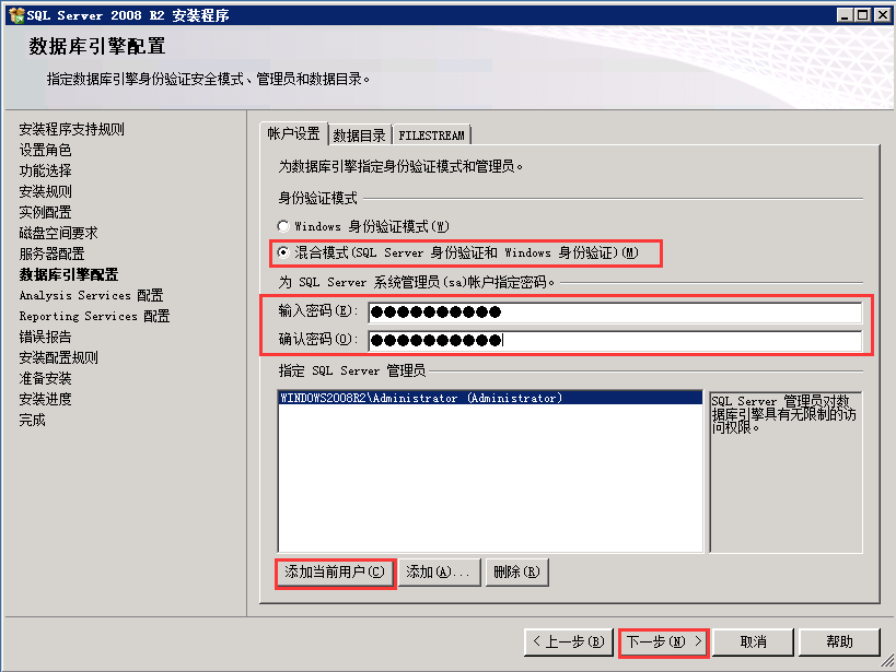 4.1.9数据库引擎配置,建议选择混合模式,注:牢记设置的密码!!!