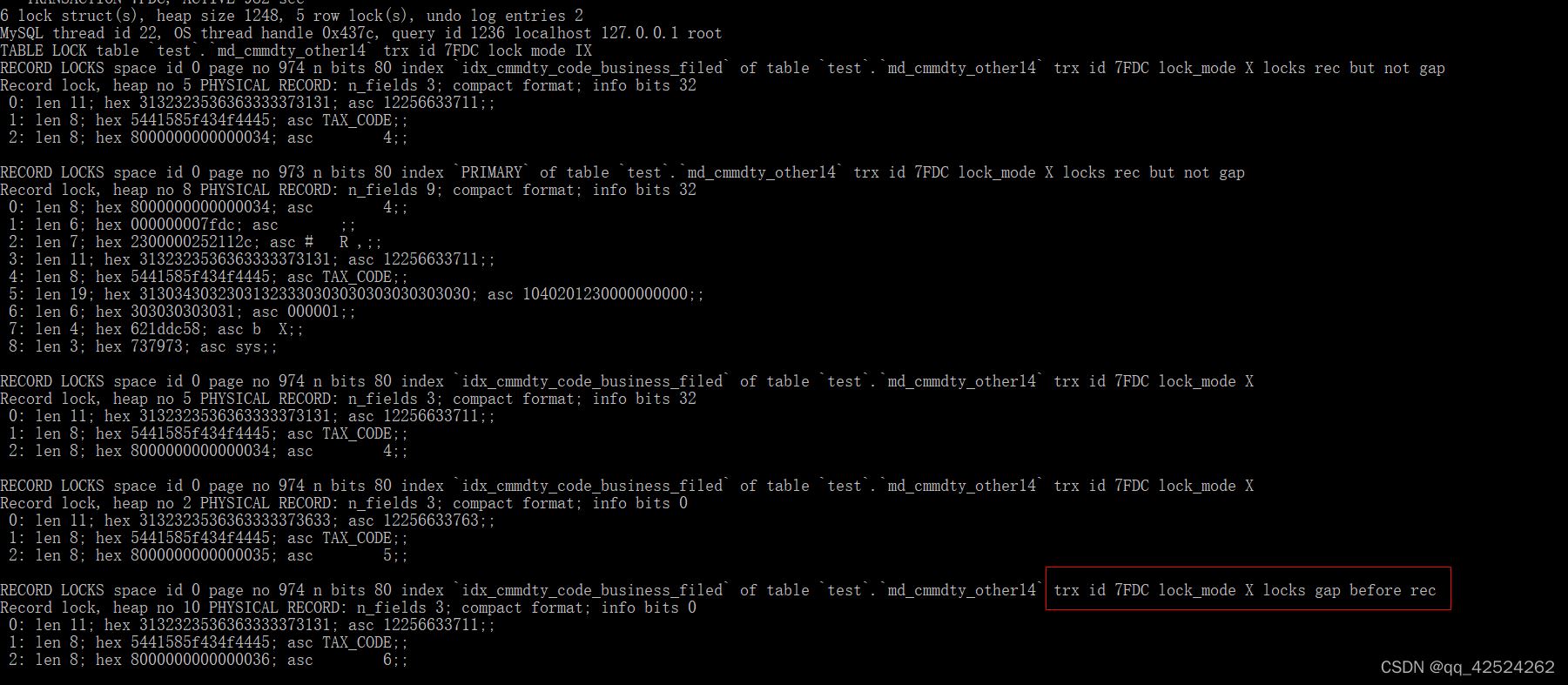 RECORD LOCKS space id 306 page no 1310102 n bits 496 index idx_cmmdty_code_business_field of table `nsfbusprd`.`md_cmmdty_other19` trx id 2120576728 lock_mode X locks rec but not gap //持有记录锁