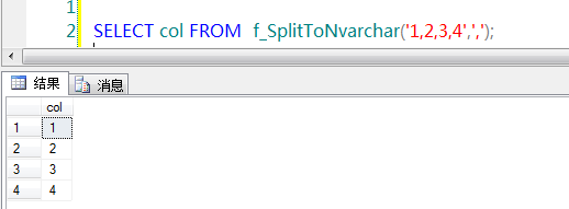 SELECT col FROM f_SplitToNvarchar(‘1,2,3,4′,’,’);