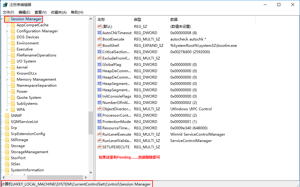 HKEY_LOCAL_MACHINE\SYSTEM\CurrentControlSet\Control\Session Manager,然后在右侧框中找到PendingFileRenameOperations