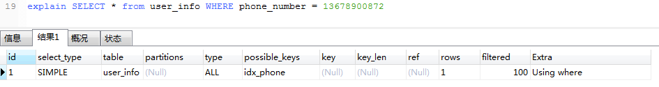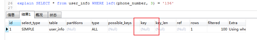 但是如果在按照phone_number字段为字符串类型进行查询的时候,Mysql没有进行隐式的类型转换,所以最终还是走了索引。