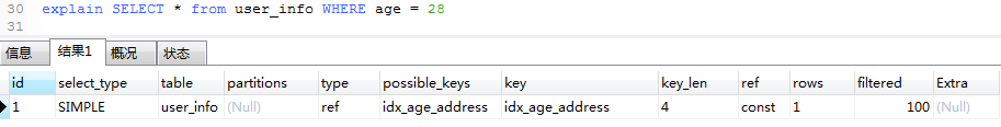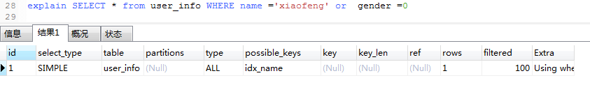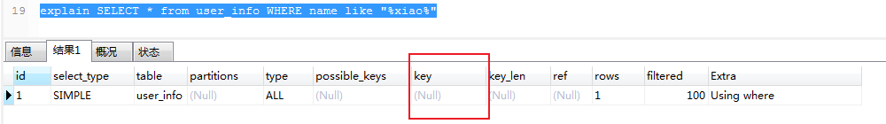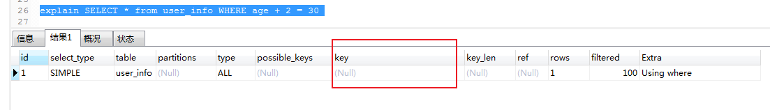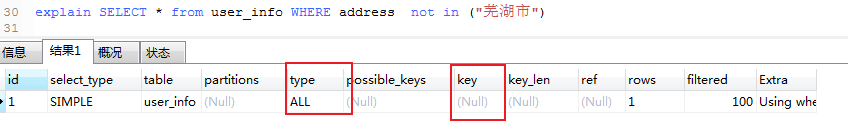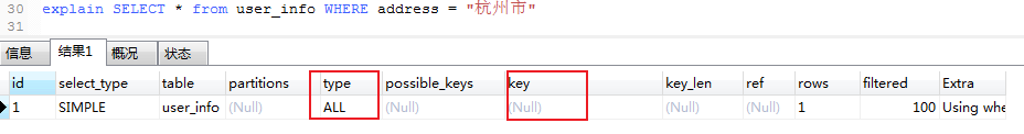 进行SQL数据查询的时候,where条件字段类型与实际表中字段类型不匹配的时候,Mysql会进行隐式的数据类型转换,而类型转换会使用到内置函数,导致在进行数据查询的时候并没有使用索引。我们可以使用explain命令查看sql语句。可以看的出来在key栏中,对应的值为null,说明并没有使用索引进行查询。