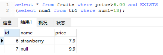 例2:查询tb1表中是否存在num1=13的记录,若存在,则查询fruits表中price大于6.00的记录。