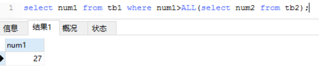 select num1 from tb1 where num1>ALL(select num2 from tb2);