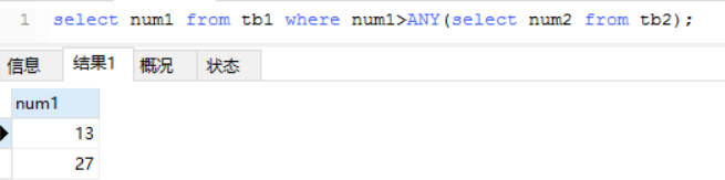 例:查询tb1中的所有数据,只要大于tb2表中数据的任意值,既符合查询条件。