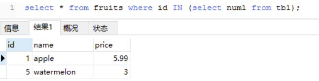 例如:查询tb1表中的num1字段下的数据作为数据列,fruits表中id字段下的数据与其进行比较,返回符合条件的记录。