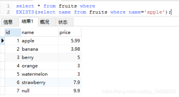 例1:查询fruits表中name字段下是否有apple,若有则查询fruits表中的记录,否则不查询。