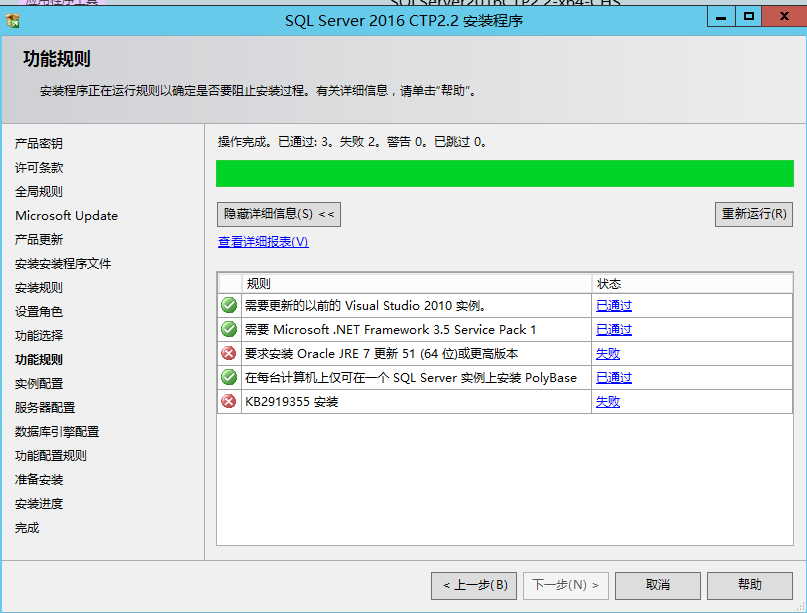 安装过程中的第一个坑来了,如果你勾选了PolyBase,它是需要安装JAVA JRE的,因为它需要调用JRE来查询hadoop数据