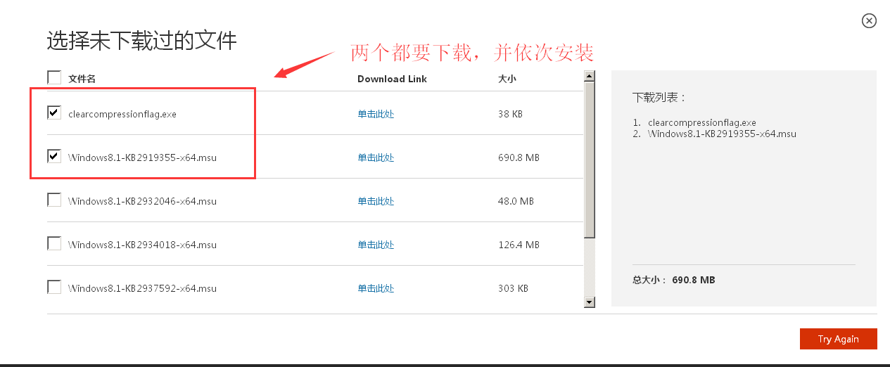需要同时下载clearcompressionflag.exe和Windows8.1-KB 2919355-X64.msu