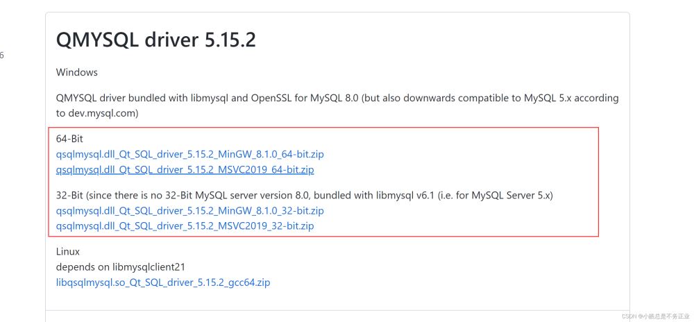 按照你的Qt编译版本和机器位数进行下载,比如我的机器是64位,编译环境是MSVC就下载qsqlmysql.dll_Qt_SQL_driver_5.15.2_MSVC2019_64-bit.zip
