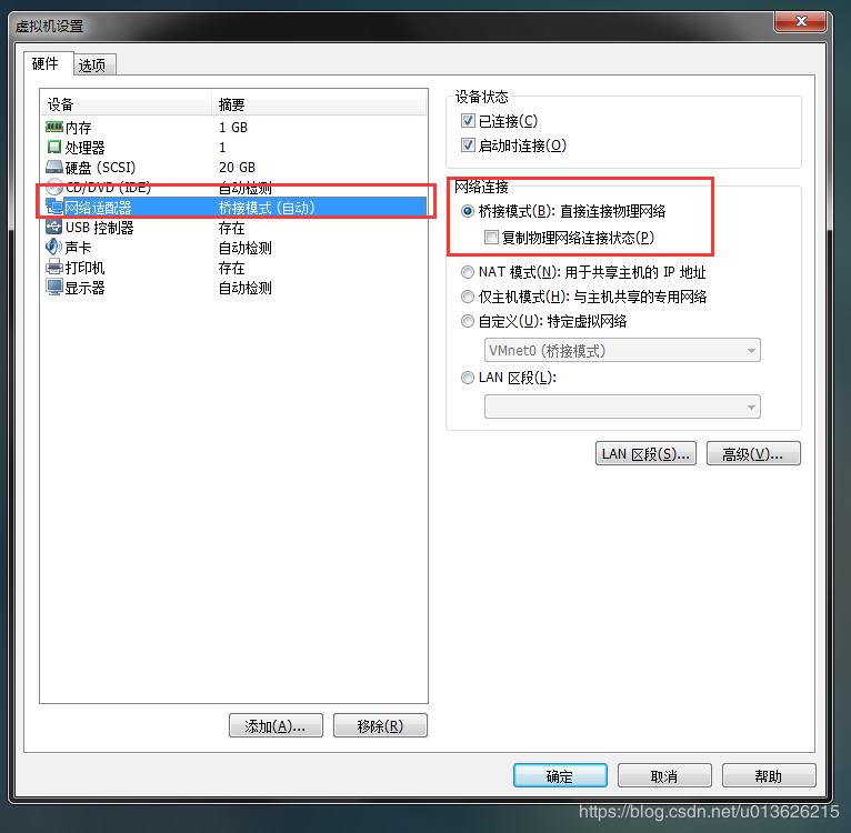 一、打开虚拟机的设置页面,设置虚拟机桥接模式如图:选择桥接模式(复制物理网络连接可选)