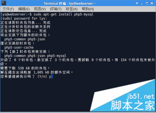 打开”终端窗口”,输入”sudo apt-get install php5-mysql”–>回车–>安装成功,安装这个模块后,php才能支持mysql。