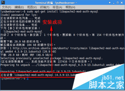 打开”终端窗口”,输入”sudo apt-get install libapache2-mod-auth-mysql”–>回车–>安装成功,安装这个模块后,apache才能支持mysql。