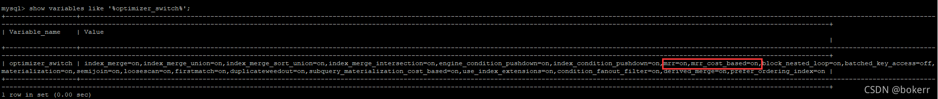 Multi-Range Read 是否启用,由如下参数中的,mrr 和 mrr_cost_based 标记进行控制,mrr标记是 MRR优化的开关。若前者设置为on,后者设置为off表示当满足条件时总是使用MRR优化;若前者设置为 on,后者也设置 on 表示通过 cost base 方式判断是否需要 MRR优化。