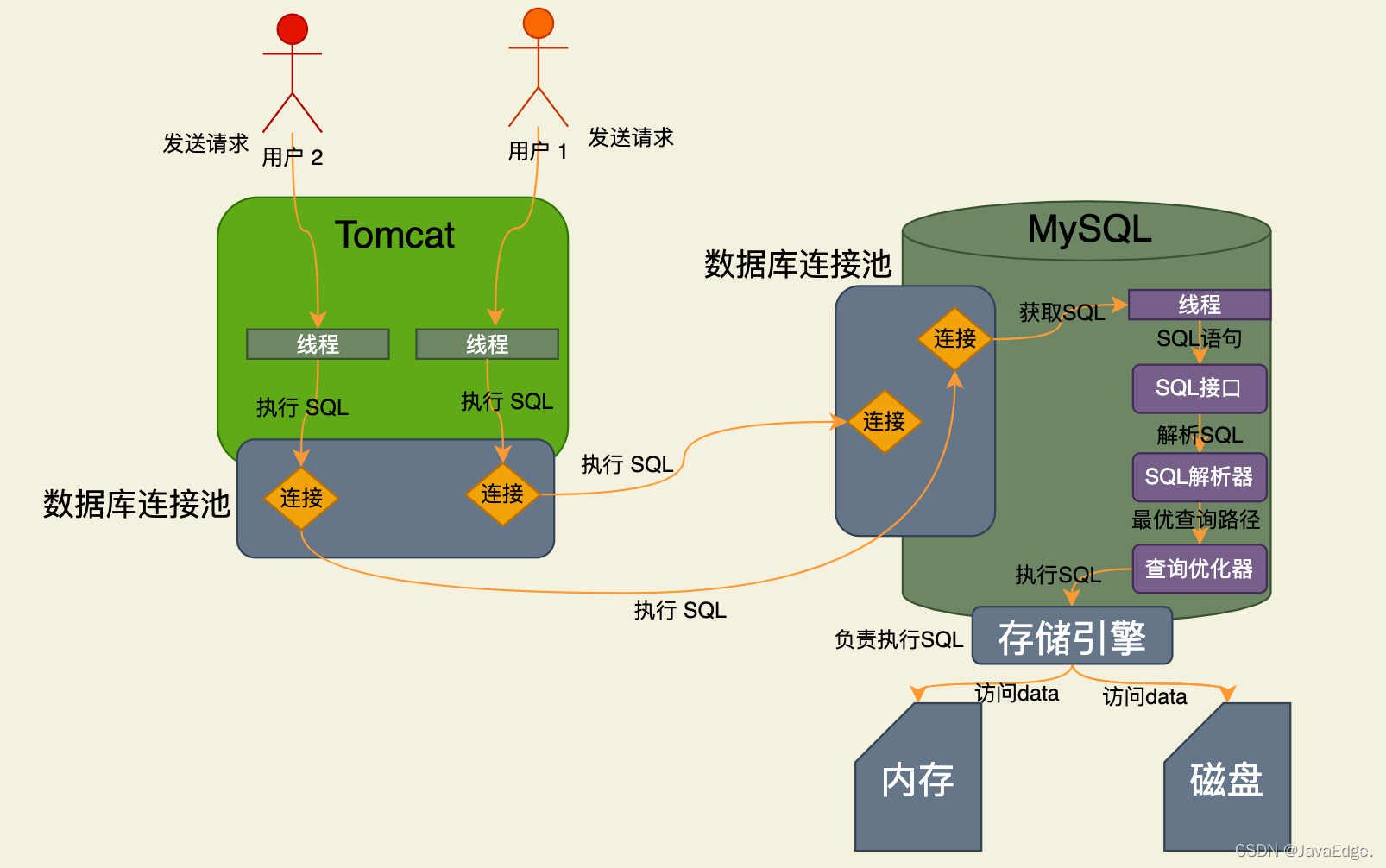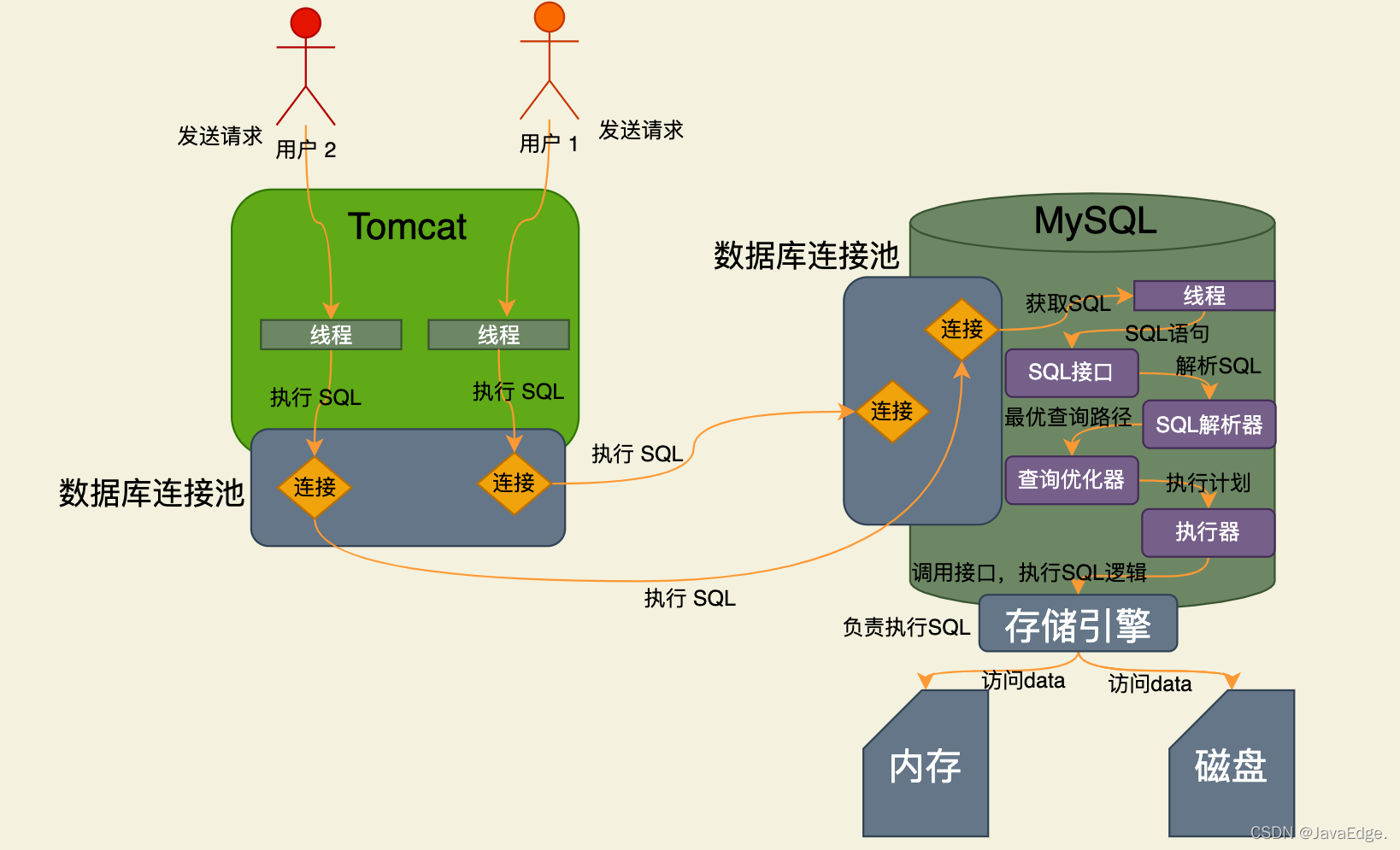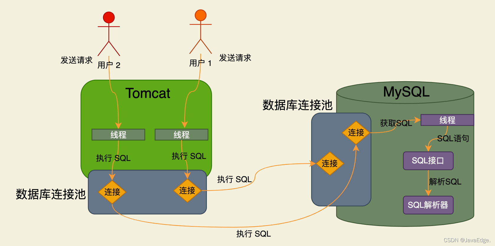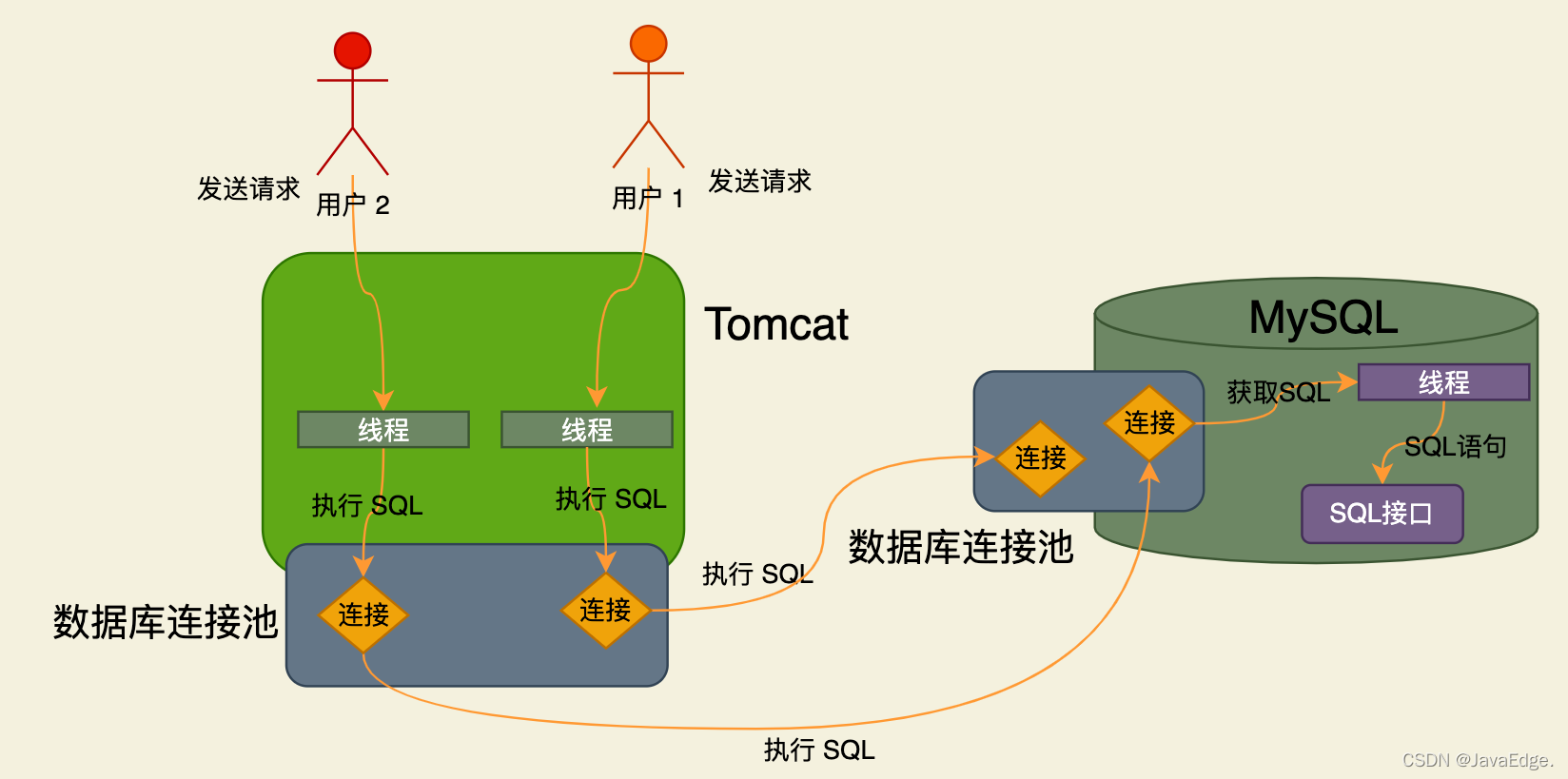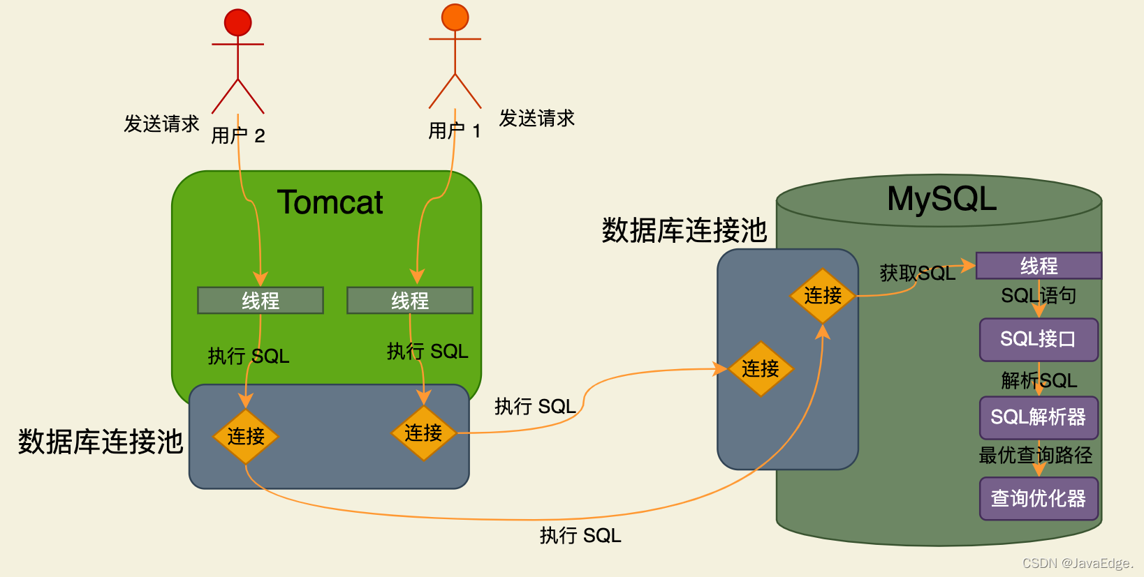 系统只要能从数据库连接池获取到一个数据库连接,就能执行CRUD。可通过数据库连接将待执行SQL发给MySQL。