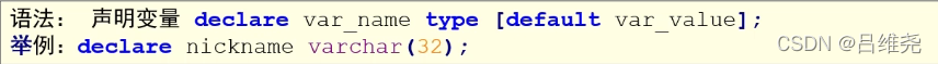 declare var_name01 varchar(20) default ‘aaa’; — 声明/定义变量