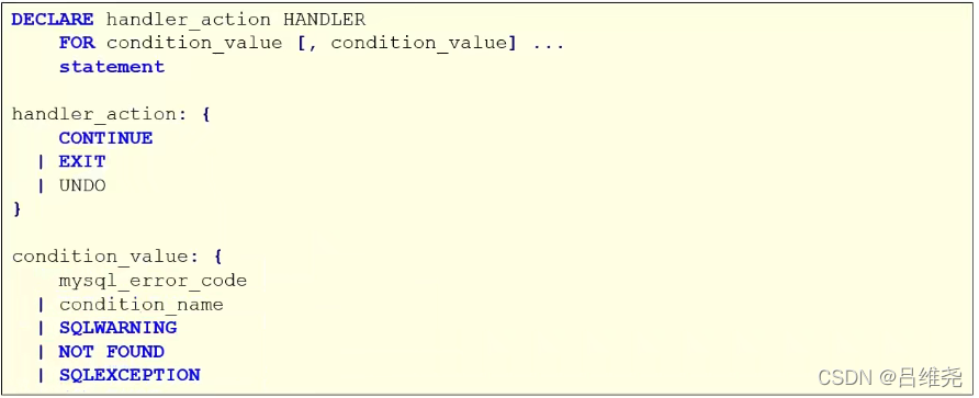 MySQL存储过程也提供了对异常处理的功能:通过定义HANDLER来完成异常声明的实现