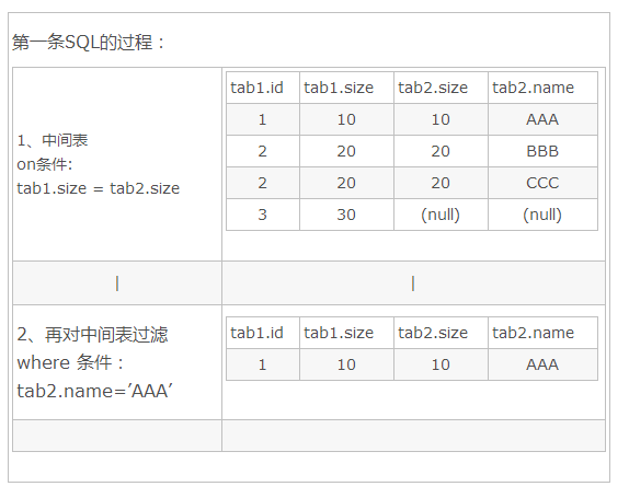 2、select * form tab1 left join tab2 on (tab1.size = tab2.size and tab2.name=’AAA’)