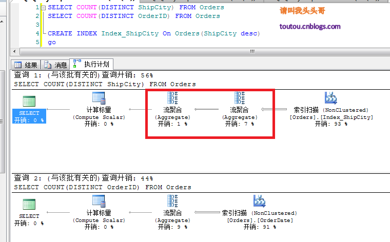 从上图中可以看到,加了索引以后COUNT(DISTINCT ShipCity)的查询变成了两个流聚合,而没有了排序,节省了开销。