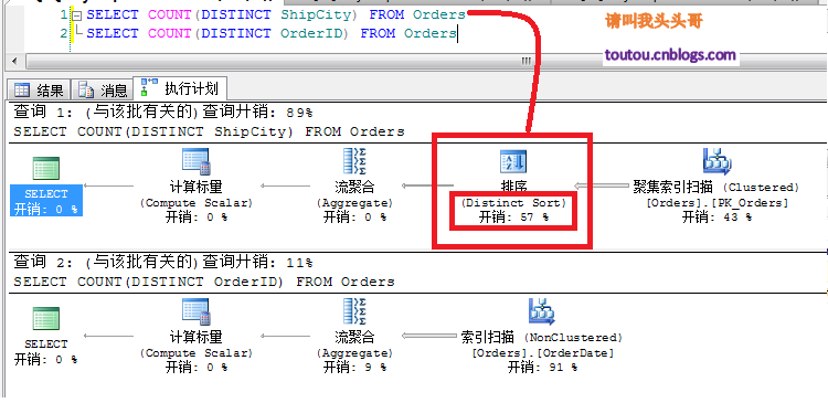 从上图中可以看到,其实这两个查询从语句上来说没什么太大的区别,但是为什么开销会不一样,一个是查询城市一个是查询订单号。这是因为其实DISTINCT对于OrderID查询来说,是没有什么意义的,因为OrderID是主键,是不会有重复的。而ShipCity是会有重复的,Sql server的去重机制在去重的时候,会有一个排序的过程。这个排序还是比较消耗资源的。