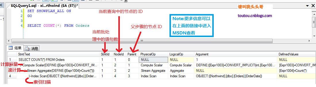 通过SET SHOWPLAN_ALL ON我们来看看COUNT()具体做了那些事情: